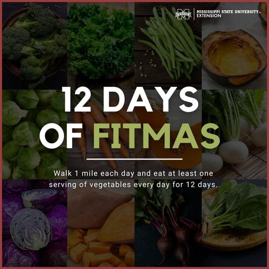 Join our Walk with Extension 12 Days of FITMAS Challenge this year starting on December 5. The 12 Days of Fitmas challenge emphasizes moving more and eating more vegetables. Physical activity like walking is one of the best things we can do for our health. Each day, we will share the vegetable of the day, along with walking and movement tips to help you improve your health! You will also have the opportunity to join us for virtual cooking demonstrations and interviews with health professionals and experts.