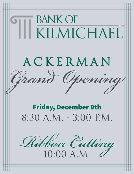 It’s time to celebrate the opening of the Bank of Kilmichael in Ackerman. Join us in the fun!