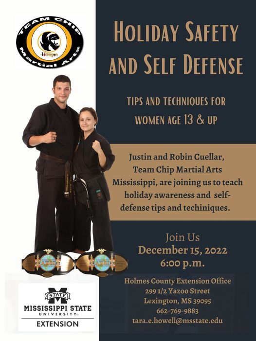 Join us for self-defense tips and techniques taught by Team Chip Martial Arts Mississippi on December 15, 2022. To register or for more information, please contact the office at 662-769-9883.
